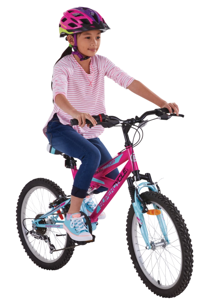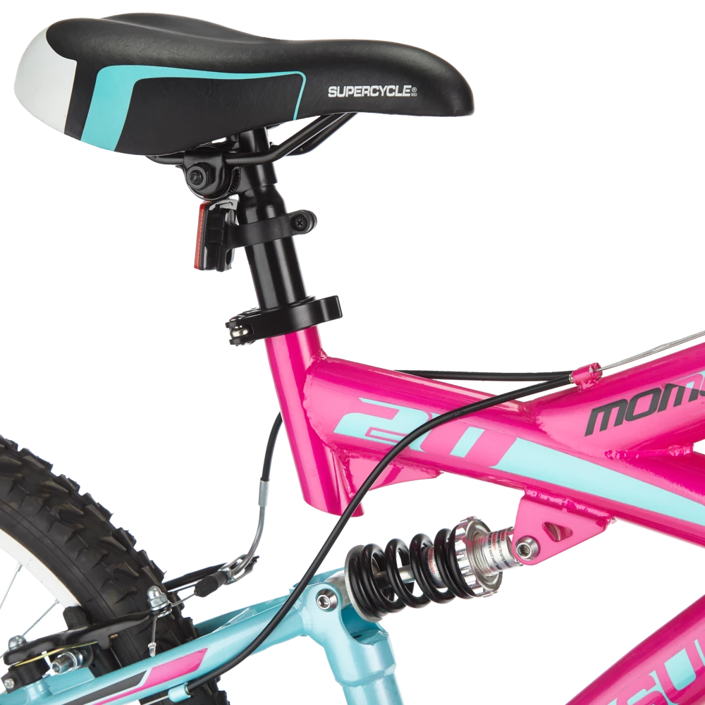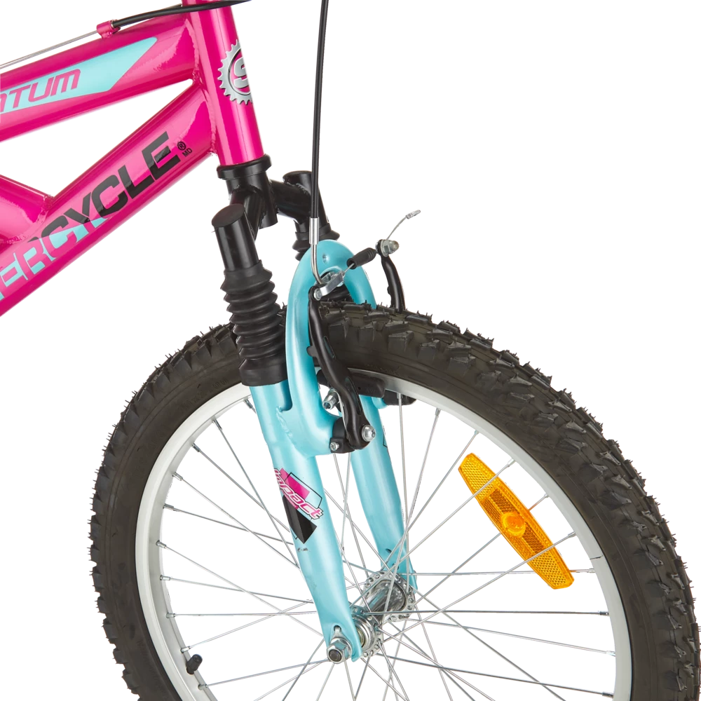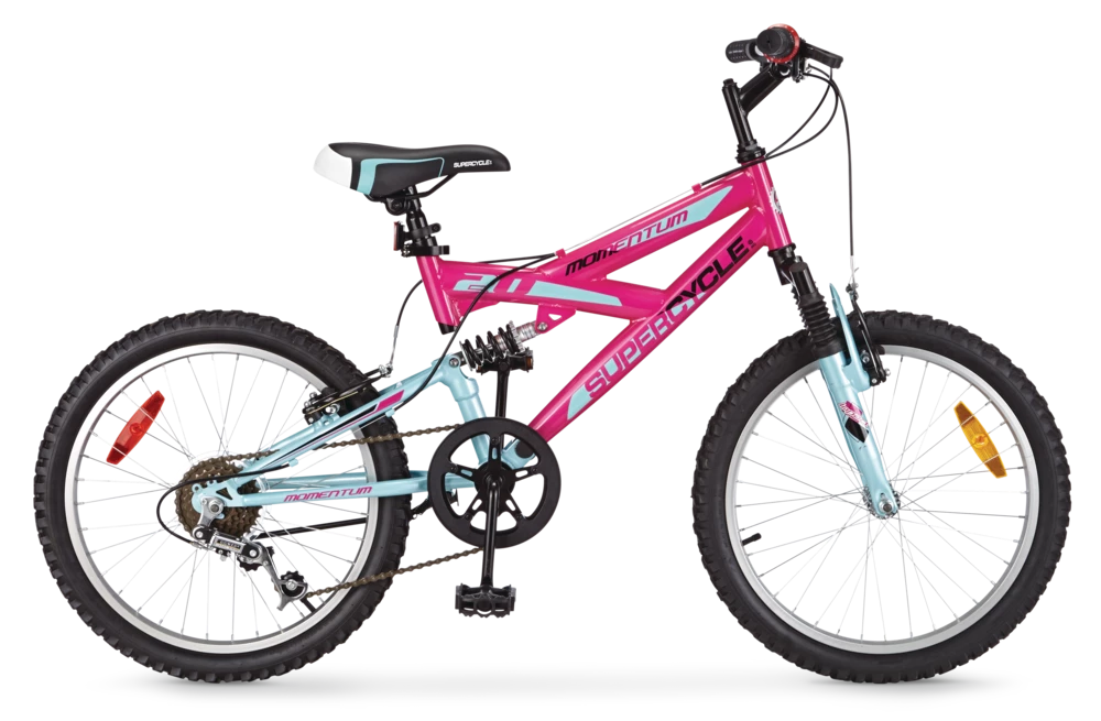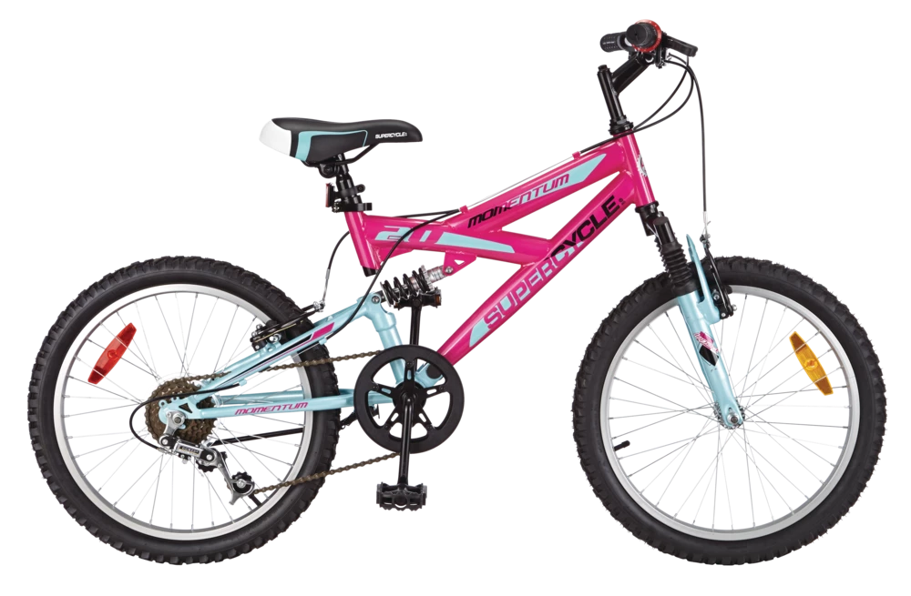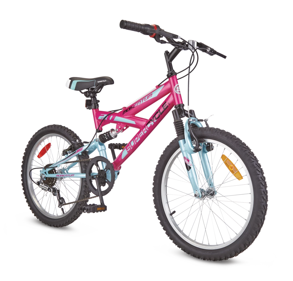 The Supercycle Momentum 20″ Bike has great off-road capability and features an easy-to-use, 5-speed grip shifting system. The bike has a front suspension fork and rear suspension, making tackling uneven terrain much easier. The front and rear V-brakes ensure you stop when you need to. Keep the momentum going with this great-value dual suspension bike.