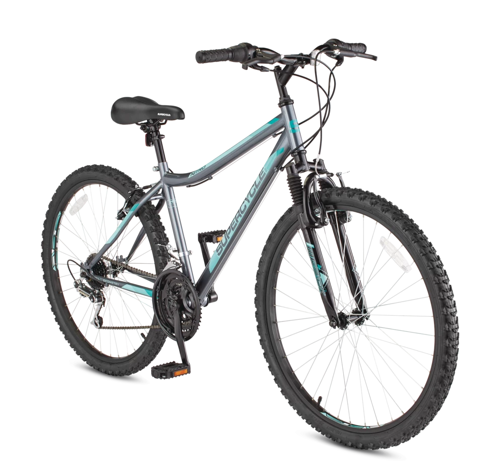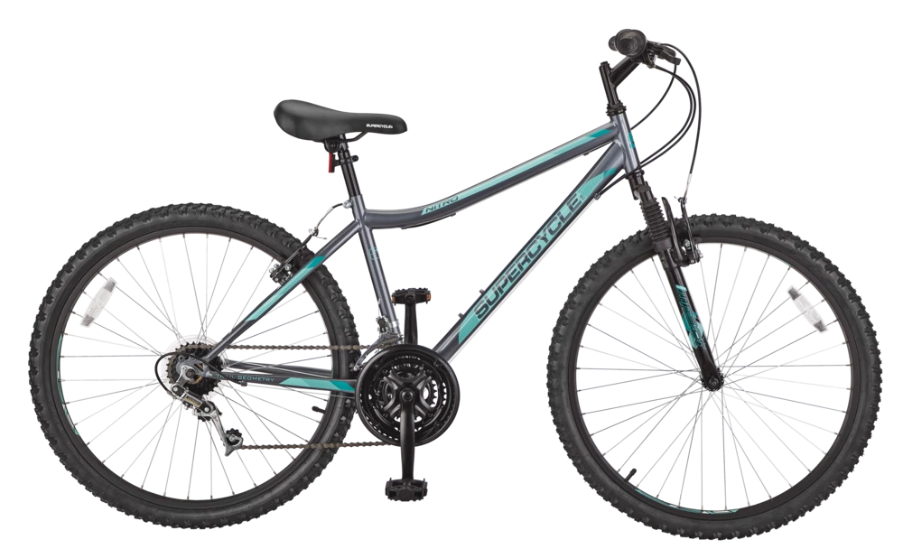 The Supercycle Nitro XT 26″ Hardtail Mountain Bike is a great entry level mountain bike. Whether you are riding around the neighbourhood or doing some light trail riding, this bike is great to get you started. With a front suspension, an easy to use 21-speed grip shifting system, and a 3-piece crank, the Nitro offers great value and will surely set your wheels in motion.