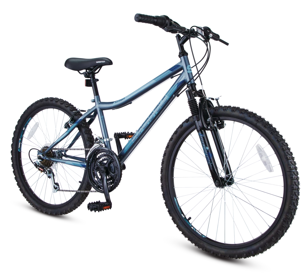 The Supercycle Nitro XT 24″ Youth Hardtail Mountain Bike is a great entry level mountain bike. Whether you are riding around the neighbourhood or doing some light trail riding, this bike is great to get you started. With a front suspension, an easy to use 21-speed grip shifting system, and a 3-piece crank, the Nitro offers great value and will surely set your wheels in motion.
