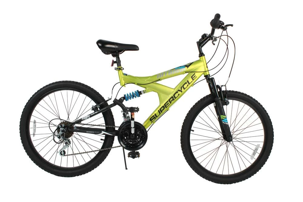 The bright green colour highlights the sleek style of this Supercycle Nitrous Bike! A dual suspension gives you a smooth, stable ride in any terrain. With 21 speeds to choose from, you can easily decide how difficult you want your ride to be. Adjustments are easy with the Shimano grip shifters. Front and rear v-brakes ensure that your stops are swift and careful. This bike is prepared for your next great adventure!