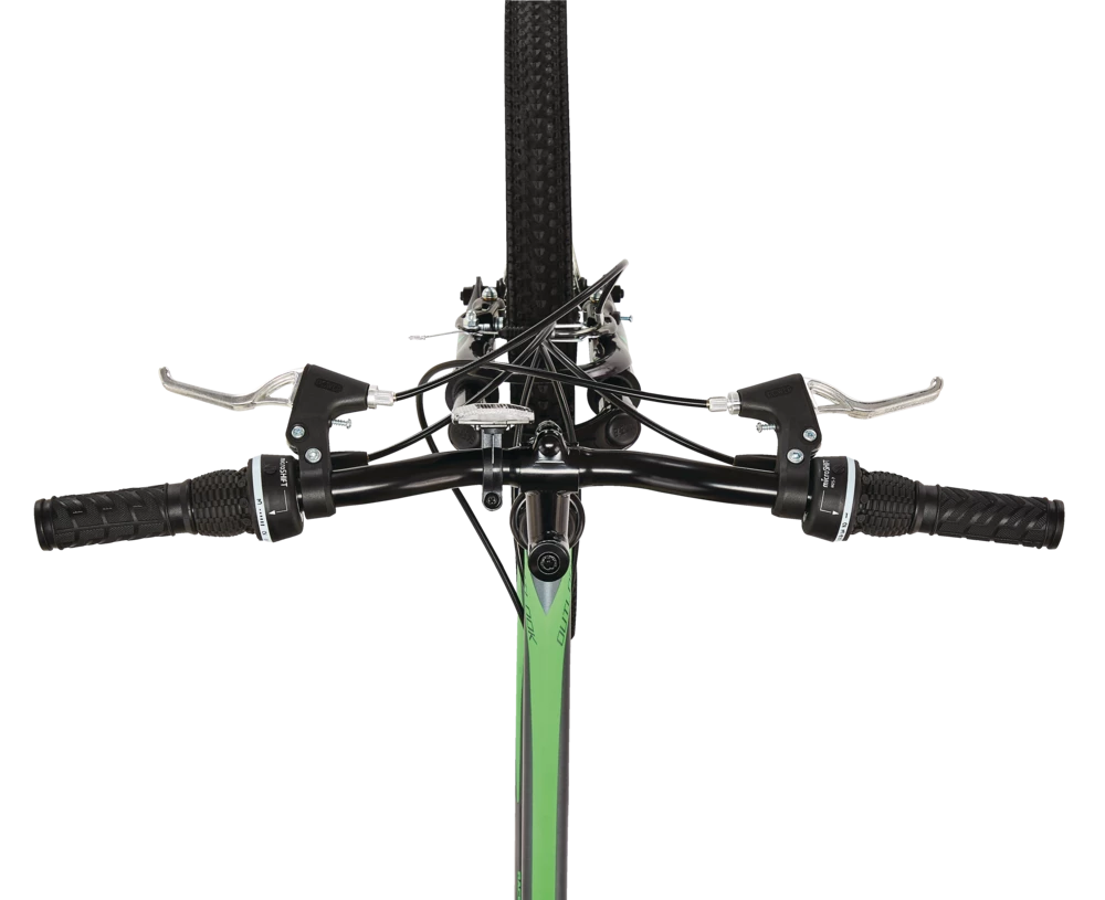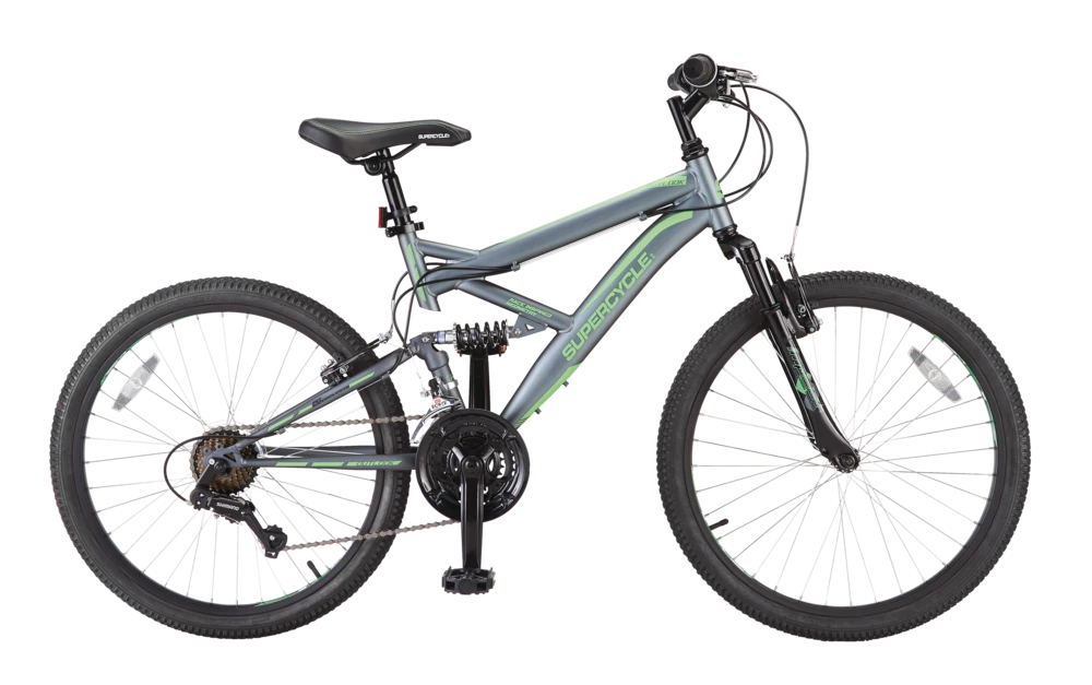 The Supercycle Outlook 24″ youth dual-suspension Mountain Bike merges great value with helpful features such as the V brakes with alloy levers, a Shimano rear derailleur, and an easy-to-use grip shifting system. The front suspension fork and rear suspension system offer comfortable rides on and off the road. If you are looking for great value in a dual suspension bike, the Outlook is the bike for you.