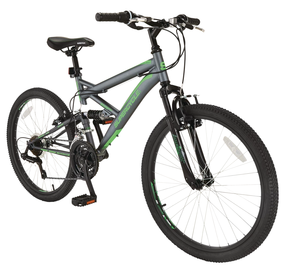 - Supercycle Outlook Dual Suspension Mountain Bike features a steel 16″ (40 cm) frame