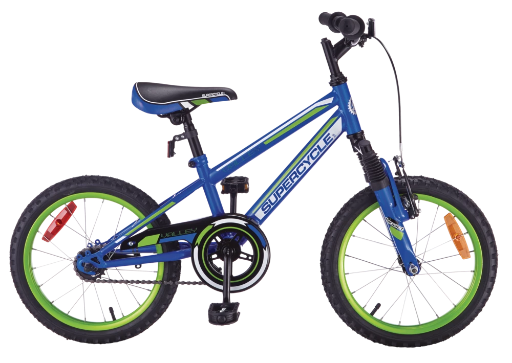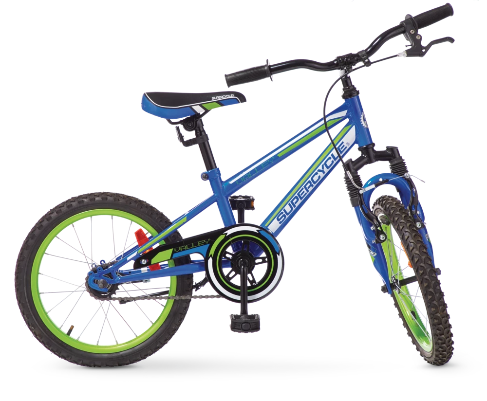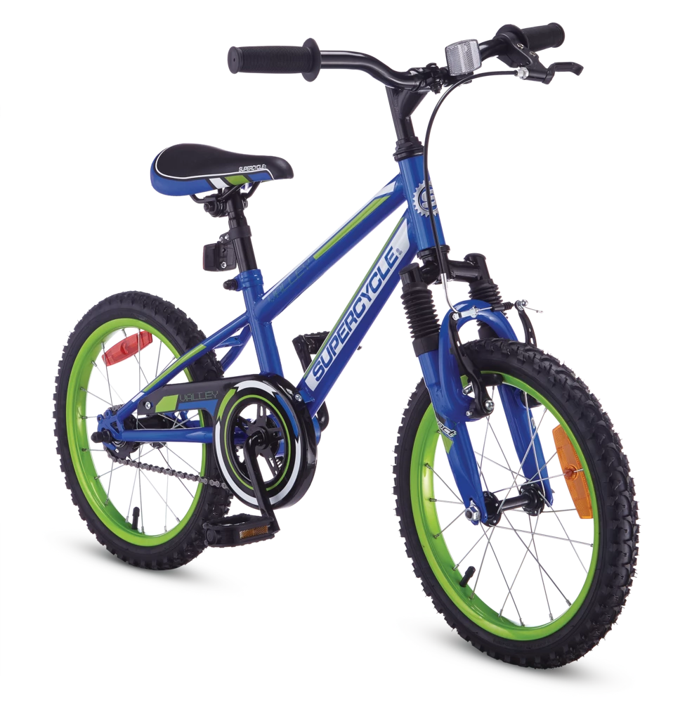 The Supercycle Valley Kids 16″ Bike is a great choice for introducing your little one to mountain biking. This bike comes equipped with an easy-mount sloping frame, making it easy to get on and off, plus a front suspension fork to tackle uneven terrain. The front V-brakes paired with rear coaster brake will ensure your child learns how to use hand brakes, while still having the safety of a pedal brake.
